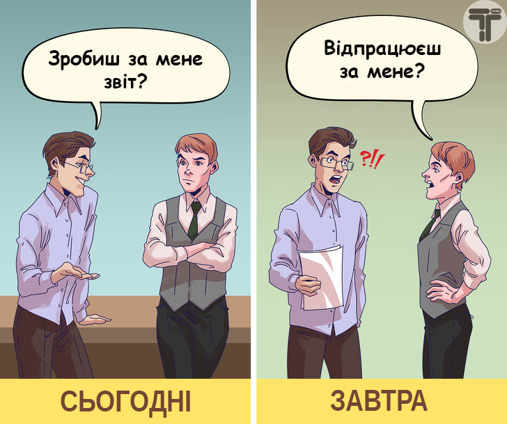 Колега любить делегувати свої обов’язки іншим, поринаючи в душевні розмови та втираючись в довіру? Уточніть, чи готовий він виконати наступного разу вашу частину завдання. Такі питання дають змогу розкрити абсурдність вимог (чи примх?) маніпулятора. У них він побачить сутність своїх претензій і, ймовірно, відступить.
