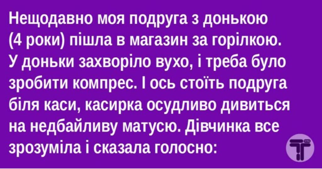 Нещодавно моя подруга з донькою (4 роки) пішла в магазин за горілкою. У доньки захворіло вухо, і треба було зробити компрес. Хотіла взяти маленьку пляшечку, але в магазині були пляшки тільки по 0,75 л. І ось стоїть подруга біля каси: в одній руці дитина, в іншій пляшка. Касирка осудливо дивиться на недбайливу матусю. Дівчинка все зрозуміла і сказала голосно на захист мами: