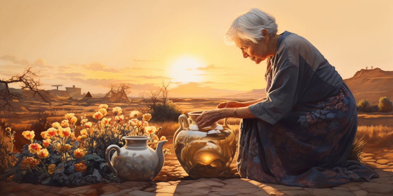 В однієї бабусі було два великих глечики. Обидва висіли на різних кінцях коромисла, яке вона носила на плечах, коли ходила по воду. Один із них мав тріщину, з якої по трохи тікала вода. Ну а інший був ідеальним і завжди зберігав набрану кількість води. Коли бабуся несла воду від річки до свого будинку, з глечика з тріщиною завжди витікала половина води.