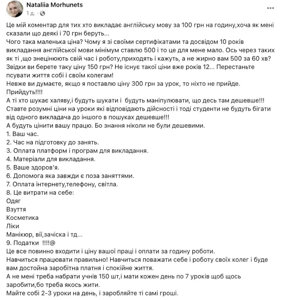 Наталія Моргунець на своїй сторінці у Facebook висловила обурення щодо низьких цін, які деякі репетитори ставлять за свої послуги. Вона вважає, що такі ціни шкодять не лише самим репетиторам, але й усій сфері освіти.
