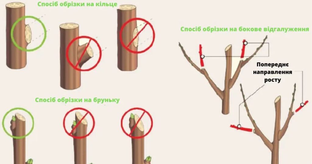 Гілки підрізуються над бруньками навскіс, щоб вода там не застоювалась, а стікала донизу. Спочатку завжди видаляють гілки, які ростуть вертикально вгору або вниз.