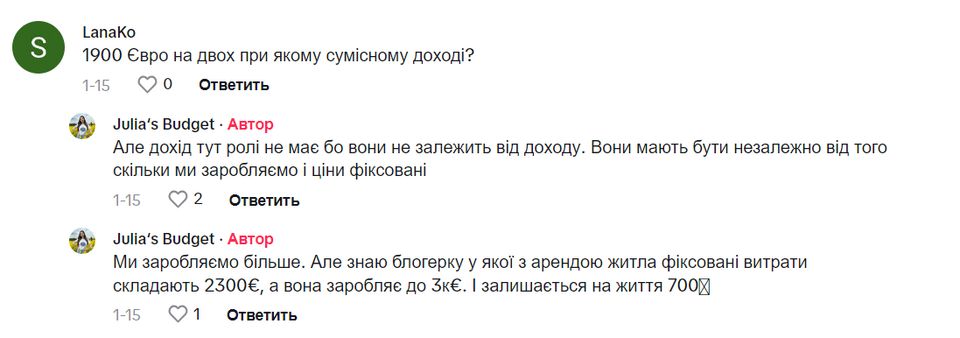 В сумі, фіксовані витрати Юлії та її чоловіка в Німеччині становлять 1900 євро на місяць. У коментарях блогерка пояснює, що це сума, яку їм необхідно сплачувати щомісяця, незалежно від доходу.