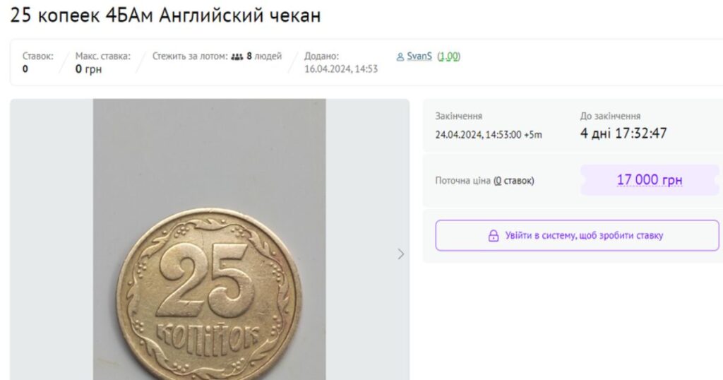 Ця монета з каталожним номером 4БАм, Англійський чекан є досить рідкісною і цінною. Її оцінюють по-різному, залежно від стану та попиту. Власник лоту просить за неї 17 тисяч гривень, але ціна може зрости, якщо на неї зроблять нові ставки.