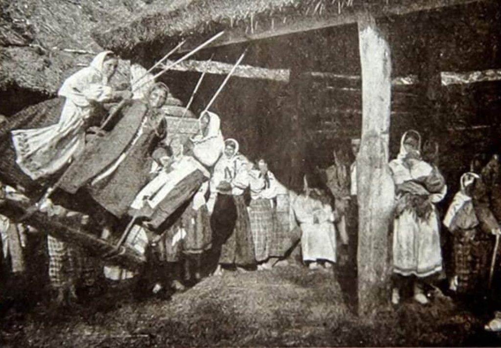 На знімку можна побачити стародавній весняний ритуал “орел” або “гойдалки”, який традиційно виконували дівчата на Великдень.