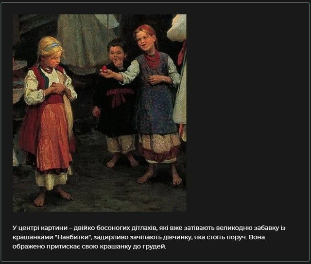 Зате в усіх присутніх на картині є крашанки. Діти ними вже навіть трохи б’ються.
