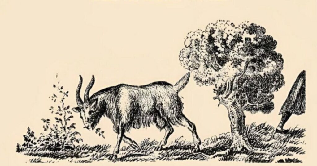 На цій давній гравюрі зображено козу, що пасеться на полі. Проте десь поряд ховається й її господиня. Ваше завдання – знайти дівчину протягом 5 секунд.