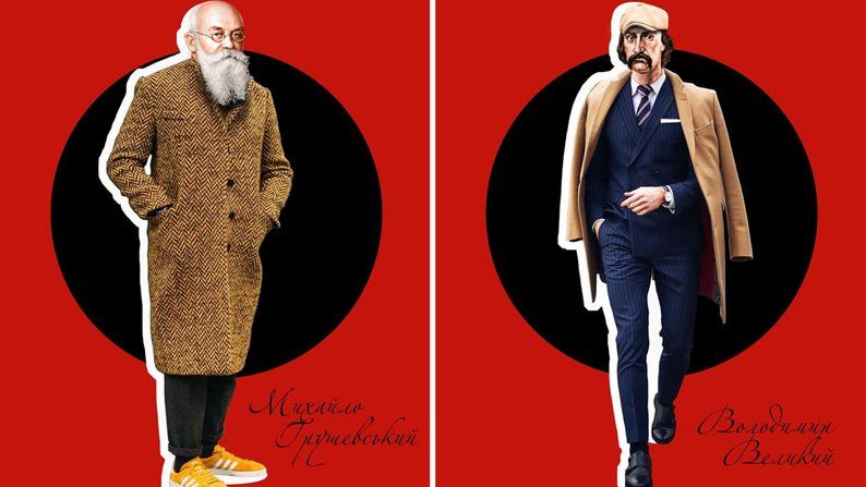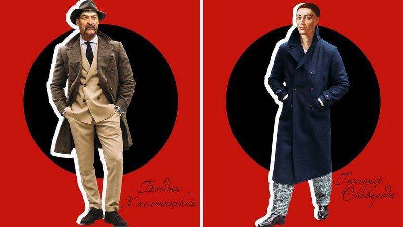 Григорій Сковорода, український філософ, постає перед глядачем у більш невимушеному стилі: темно-синій тренч. Цей образ підкреслює його мудрість, простоту та близькість до народу.