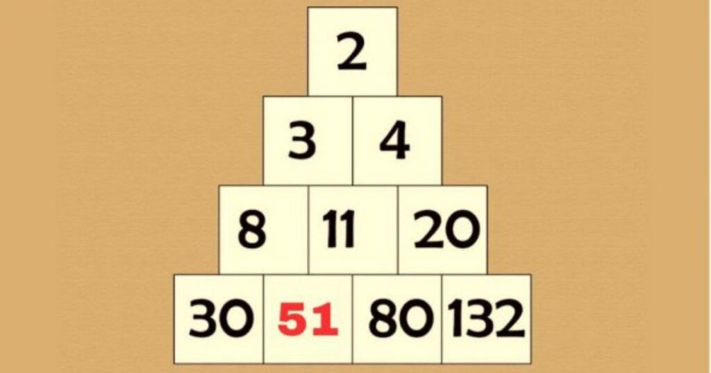 Підказка: Розглядайте числа в піраміді як послідовність: 2, 3, 4, 8, 11, 20, 30, ?, 80, 132.