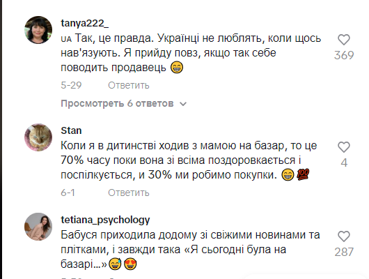 Сюди приходять, щоб дізнатися новини, місцеві плітки. Дехто ходить сюди щодня поспілкуватися. Атмосфера українського базару нагадує атмосферу затишного сільського пабу в Англії, де люди збираються, щоб поспілкуватися, поділитися новинами та насолодитися компанією один одного. – розповідає блогерка.