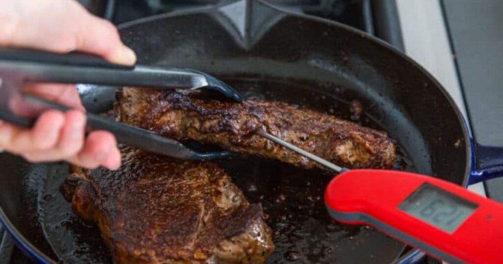Використовуйте термометр для м’яса, щоб перевірити ступінь готовності стейка. Для середньої прожарки температура в товстій частині м’яса повинна становити 63°C.