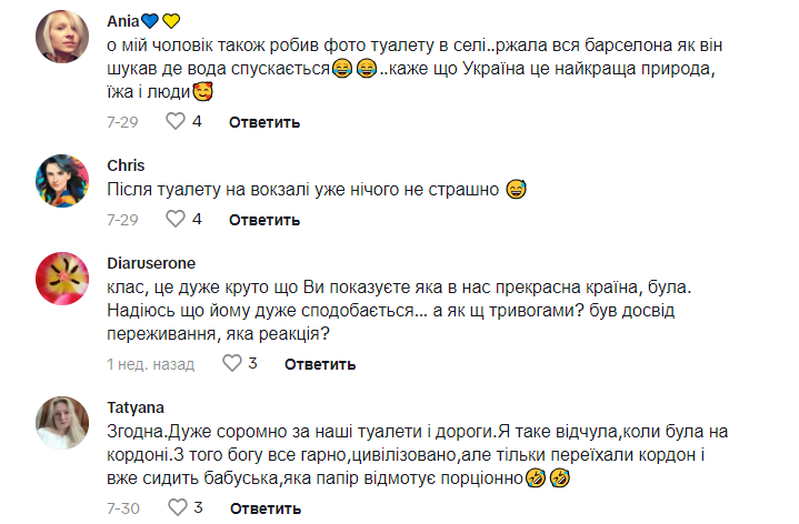Чоловік зізнається, що поїздка автобусом була виснажливою, особливо останні дві години, коли він дуже хотів у туалет. Прибувши до Львова і зайшовши в туалет на залізничному вокзалі, турист був шокований, побачивши там “просто дірку в землі”. Цей момент викликав у нього неприємні відчуття, а Юлія, коментуючи відео, сором’язливо прикрила обличчя.