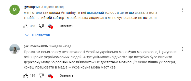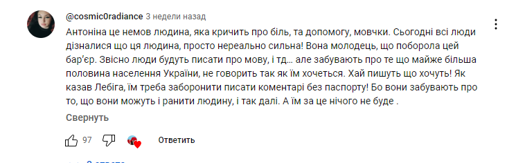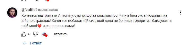 Блогерка зізналася, що довгий час соромилася своєї мови та боялася осуду з боку українців. Вона пояснила, що має тривожність щодо мовного питання і почувається звичайною жінкою з середньою освітою. Антоніна зазначила, що українську мову знає дуже погано.