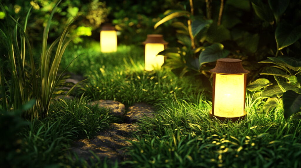- Світильники-ліхтарі — це декоративні світильники, що надають саду романтичного шарму. Вони можуть бути встановлені на стовпах, підвішені на гілках дерев або розташовані на столах та інших поверхнях.