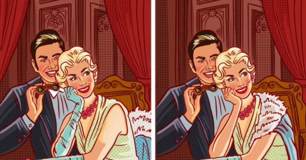 Перед вами захопливе завдання, яке перевірить вашу уважність та кмітливість. На малюнку зображена молода пара, яка з нетерпінням очікує початку вистави в театрі. Обидва виглядають елегантно та зачаровано спостерігають за дією на сцені.