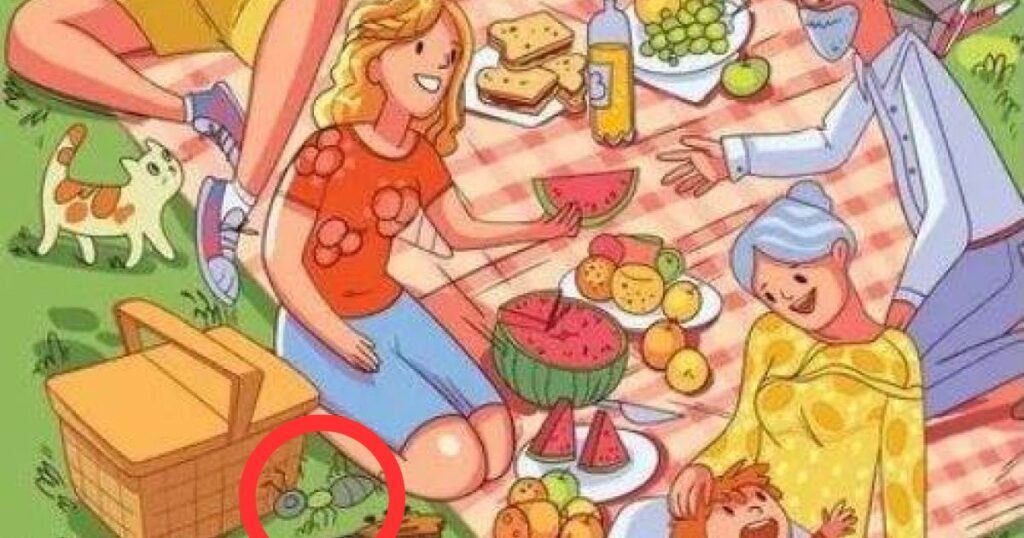 На цій картинці, яка на перший погляд зображає щасливу родину на пікніку, причаїлася маленька мурашка. Ця хитра комаха так майстерно замаскувалася, що її не відразу помітиш.