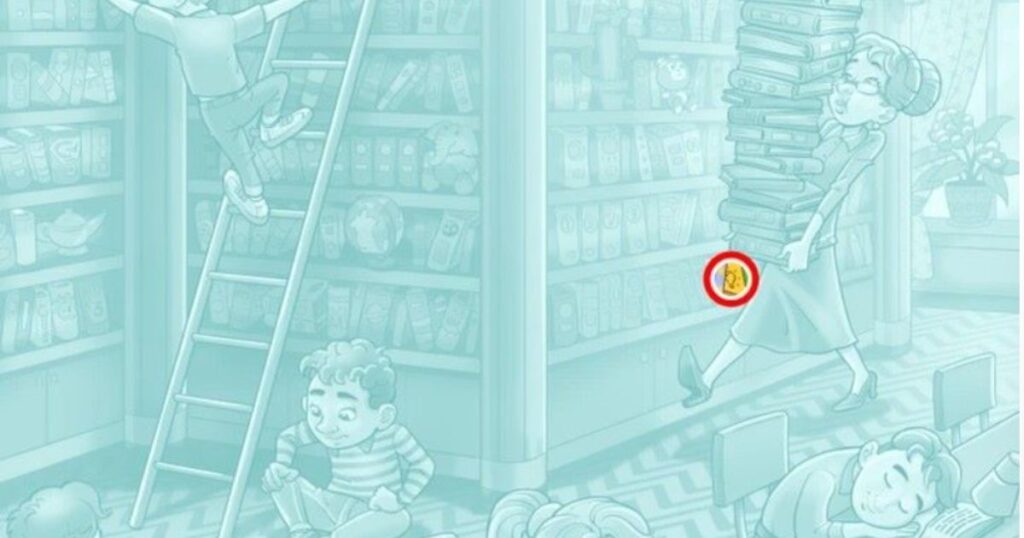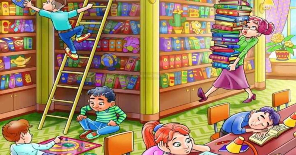 Перед нами захоплива оптична ілюзія, яка перевірить вашу уважність! На малюнку зображена затишна бібліотека, де діти з цікавістю поринають у світ книг та ігор. Бібліотекарка дбайливо розставляє нові видання на полиці. Але є одна деталь, яка ретельно прихована – маленька лампочка.