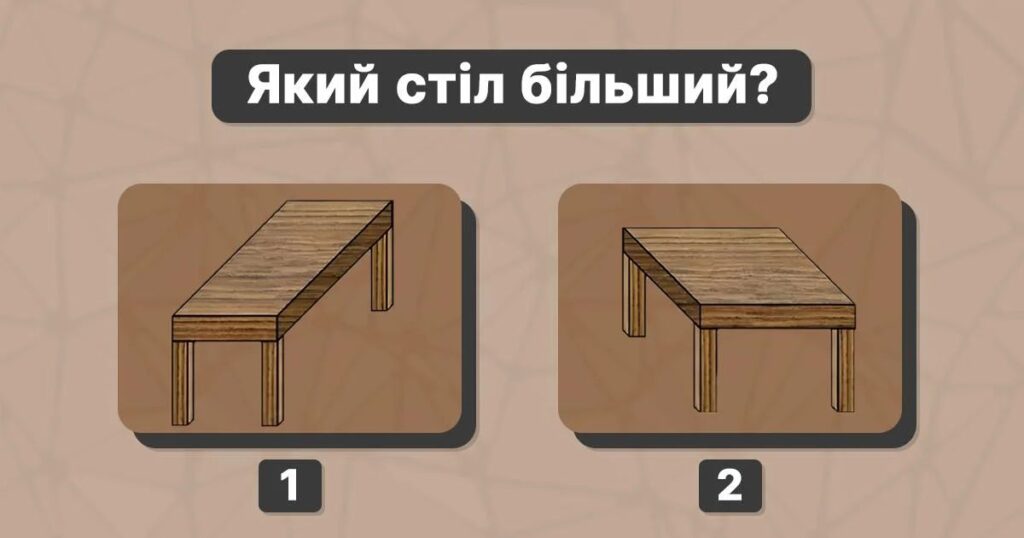 Чому ж ми бачимо різні розміри? Все справа в тому, що ми дивимося на ці столи під різним кутом. Через перспективу, один стіл здається широким і коротким, а інший – довгим і вузьким. Наш мозок намагається інтерпретувати двовимірне зображення як тривимірний об’єкт і робить помилку в оцінці розмірів.