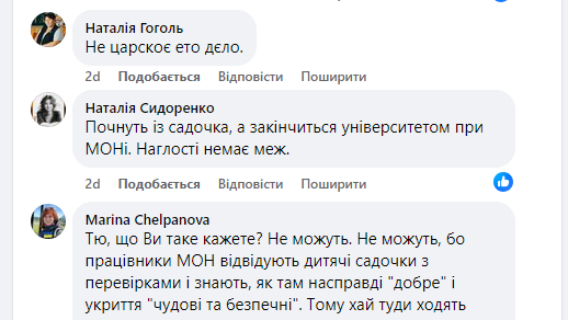 Однак, не всі схвалюють цю ідею. Деякі користувачі соціальних мереж висловили здивування з приводу того, чому діти співробітників МОН не можуть відвідувати звичайні дитячі садки. Зокрема, екс-керівник УЦОЯО Ігор Лікарчук поставив запитання: “А чому діти працівників МОН не можуть відвідувати звичайний дитячий садок?”. Його думку підтримали й інші користувачі Facebook.