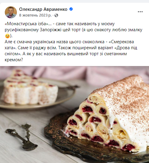 Мовознавець запитав у своїх підписників у Facebook, як вони називають цей торт у своїх регіонах. Відповіді були різноманітними: “Хатка”, “Хатинка”, “Дідова хатка”, “Піраміда”, “Вишнева гірка”, “Дамські пальчики”, “Зимова вишня”, “Вишневі соти”. Це показує, наскільки багата українська мова і як ми, українці, вміємо знаходити красиві та оригінальні назви для наших улюблених страв.