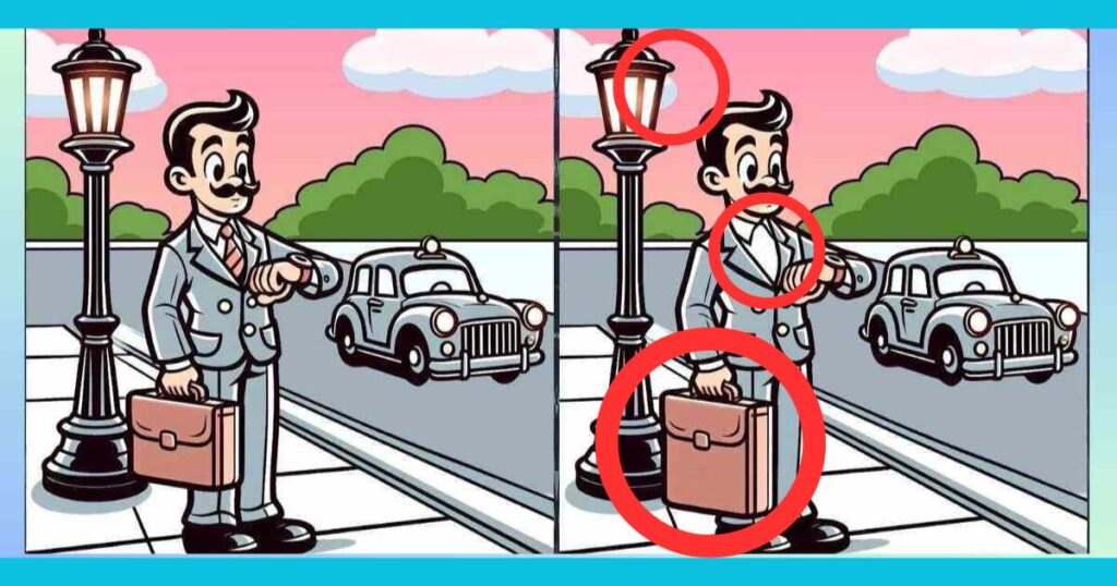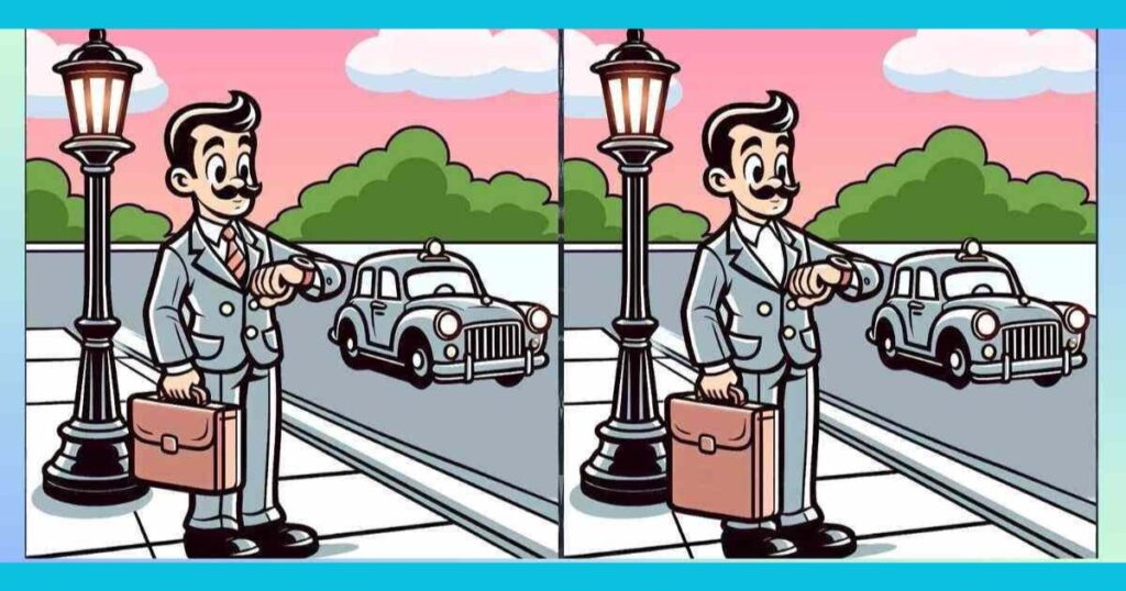 Перед вами постала досить складна головоломка, яка вимагає від вас максимальної уваги та спостережливості. На двох зображеннях зображений джентльмен, який, схоже, поспішає на таксі та нервово поглядає на годинник. Ваше завдання — віднайти три відмінності між цими двома картинками.