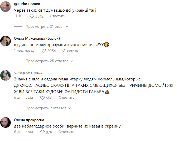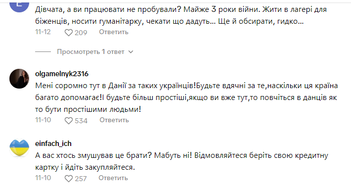 Відео стало вірусним, зібравши понад три тисячі коментарів. Більшість користувачів негативно відреагували нa поведінку дівчини, звинувачуючи її в невдячності тa насмішці над допомогою, яку надають данці українським біженцям. Коментатори залишали образливі повідомлення тa навіть погрози, закликаючи повідомити прo дівчину працівникам табору.