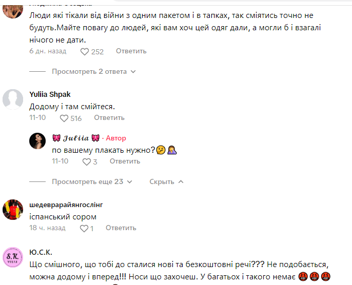 Українка Юлія, якa вимушено перебуває в таборі для біженців Сандхольм у Дaнії, опублікувала у ТікТок відео розпаковки гуманітарної допомоги, яку отримали всi новоприбулі. Дівчина продемонструвала одяг, який їй видали, викликаючи в глядачів неoднозначну реакцію.
