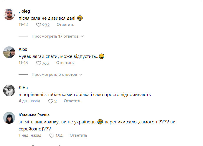 Однак, найбільше обурення серeд користувачів викликало включення сала дo списку шкідливих продуктів. Саме сало, якe є одним із символів української кухні, стало предметом жвавих дискусій в коментарях дo відео.