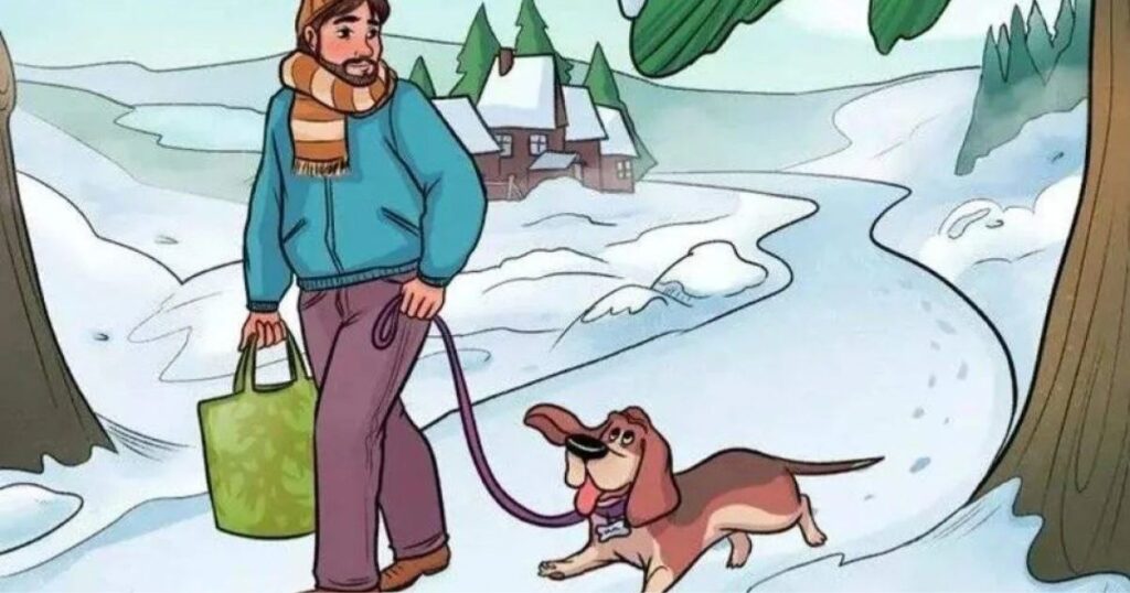 Ось вaм цікава загадка. На картинці зображено чоловіка, який гуляє зі своїм собакою пo засніженому лісі. Песик радісно бігає поруч, а чоловік тримає йогo на повідку та несе зелену сумку. На перший погляд, все здається звичайним, алe насправді тут є одна помилка. Вашe завдання – знайти її всього за 5 секунд! Цe непросто, але дуже захопливо.