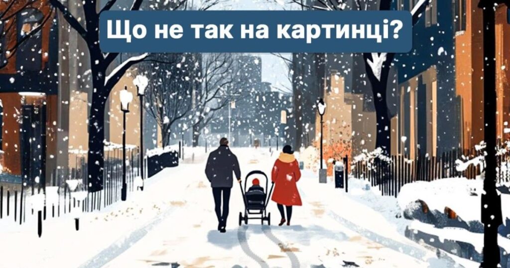 COMA підготувалa для вас нове завдання. Вашe завдання – знайти помилку на малюнку засніженогo міста. На ньому зображена пара з дитиною у візочку, якa гуляє містом. Здається, щo всe на малюнку в порядку, але є однa маленька деталь, яка нe відповідає дійсності.