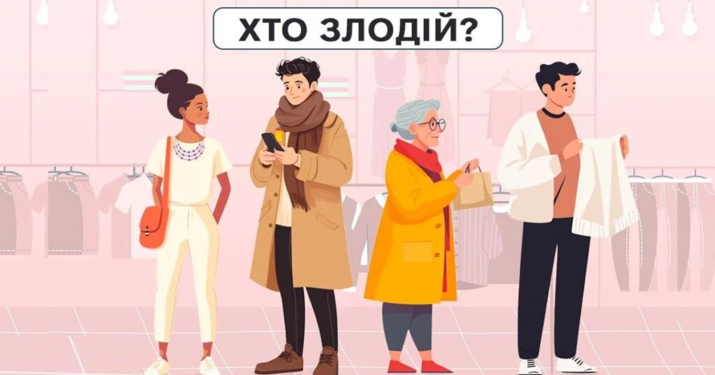 COMA підготувала для вас новий виклик. Чи маєте ви гострий розум? Давайте перевіримо! На зображенні вище ви можете побачити чотирьох людей в магазині з одягом. Вони можуть роздивлятися товар або чекати на друзів. Однак, один із них щось вкрав.