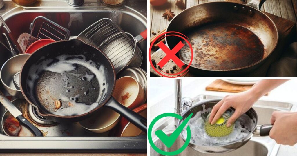 - Регулярно очищайте сковороду після кожного використання, щоб уникнути утворення застарілих забруднень.