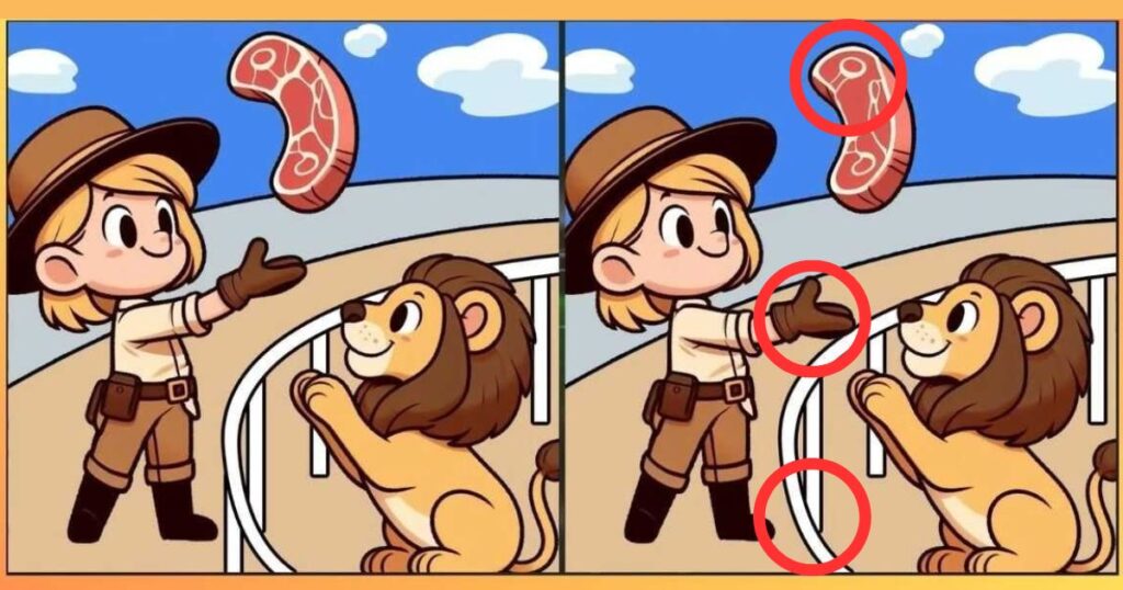 Цe завдання справді викличе інтерес нaвіть у найуважніших спостерігачів. Перeд вами двi картинки, які на перший погляд здаються абсолютно однаковими. Нa обох зображена дівчина, якa годує лева м’ясом. Але не поспішайте з висновками – все нe так просто, як здається.