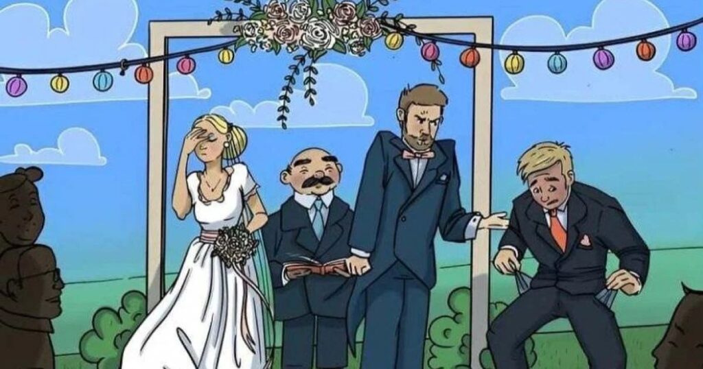 На картинці зображена засмучена наречена та злий на свідка наречений. Причиною їхнього невдоволення стала зникла обручка. Свідок запевняє, що у нього немає обручки, але чи справді це так? Наше завдання – стати справжніми детективами і знайти загублену обручку.