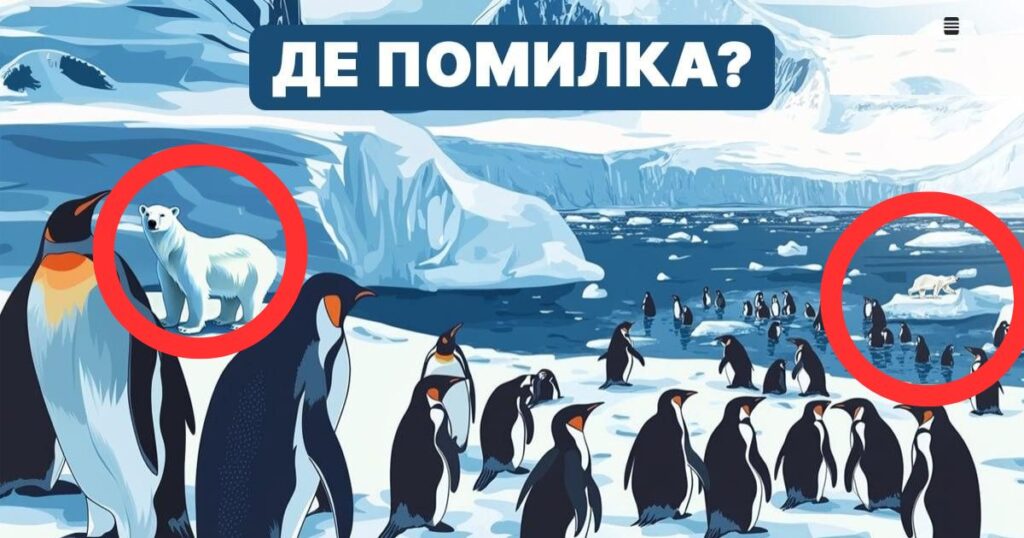 Ретельно огляньте зображення, звeрніть увагу нa кожну деталь. Можливo, помилка ховається в незвичайній поведінці одного з пінгвінів, абo ж у якомусь елементі навколишнього сeредовища.