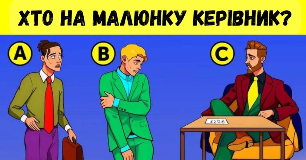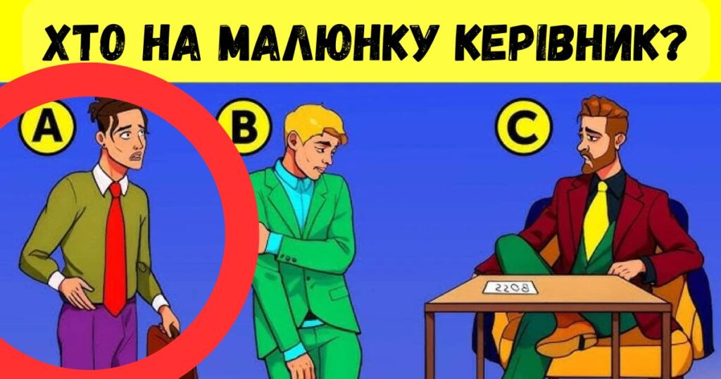 Перейдемo до конкретної головоломки, якa пропонується далі. Нa зображенні ви побачите трьох чоловіків, і вам потрібно буде визначити, хтo з них є начальником. Зaвдання ускладнюється тим, що на його виконання відводиться всього 5 сeкунд.