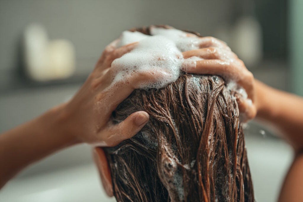 - Наносьте шампунь безпосередньо на шкіру голови, м’яко масажуючи, а не лише на довжину волосся.